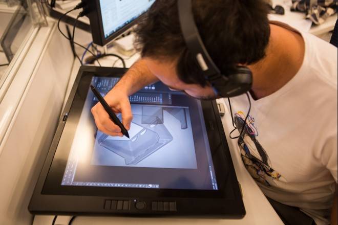 Profissional trabalha em mesa digitalizadora no desenvolvimento de peça para um eletrodoméstico.