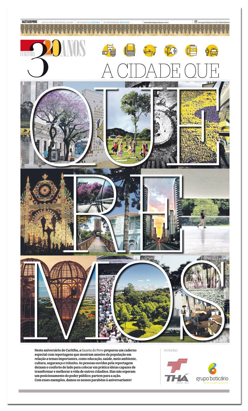Essa é um pouco mais antiga, mas vale mostrar aqui o trabalho da designer Juliana Karpinski que fez um belo trabalho com tipologia e fotos da cidade por ocasião do aniversário. É um bom contraponto com as páginas internas do caderno que seguiu como linha contar histórias de pessoas.