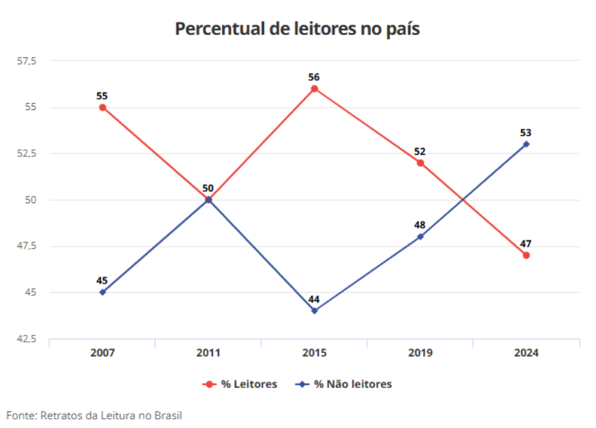 Inicialmente, vamos nos pautar na pesquisa mais recente sobre os índices de leitura no Brasil, segundo a 6ª edição da "Retratos da Leitura no Brasil” (divulgada em novembro de 2024), indica que 53% dos entrevistados não leram nem mesmo parte de uma obra nos três meses que antecederam a pesquisa, ao longo da série histórica (iniciada em 2001) é a primeira vez que o número de não leitores, supera os leitores; veja os dados abaixo: