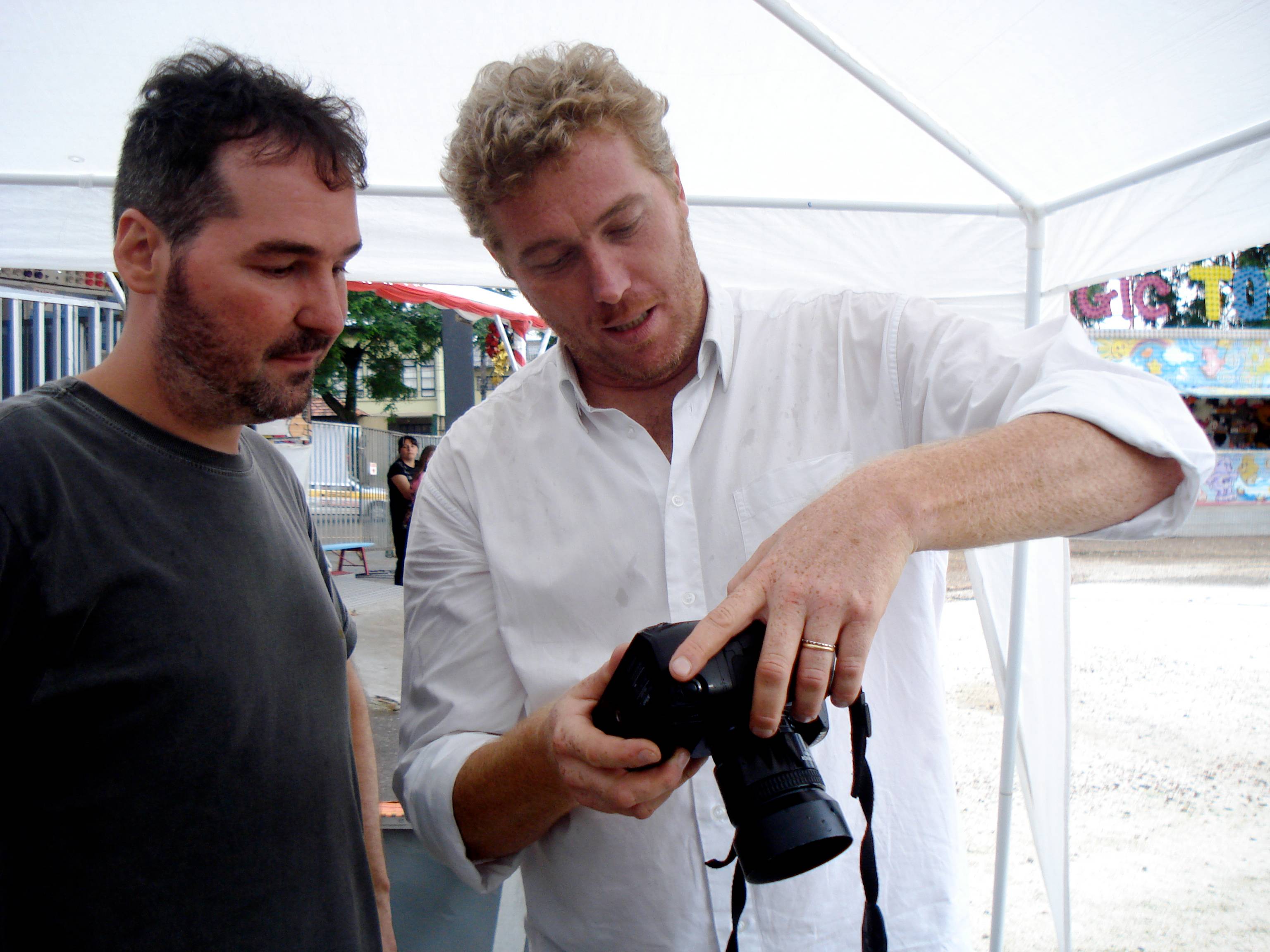O produtor Clé Carrer e o fotógrafo Mazzo checam imagens no visor da câmera