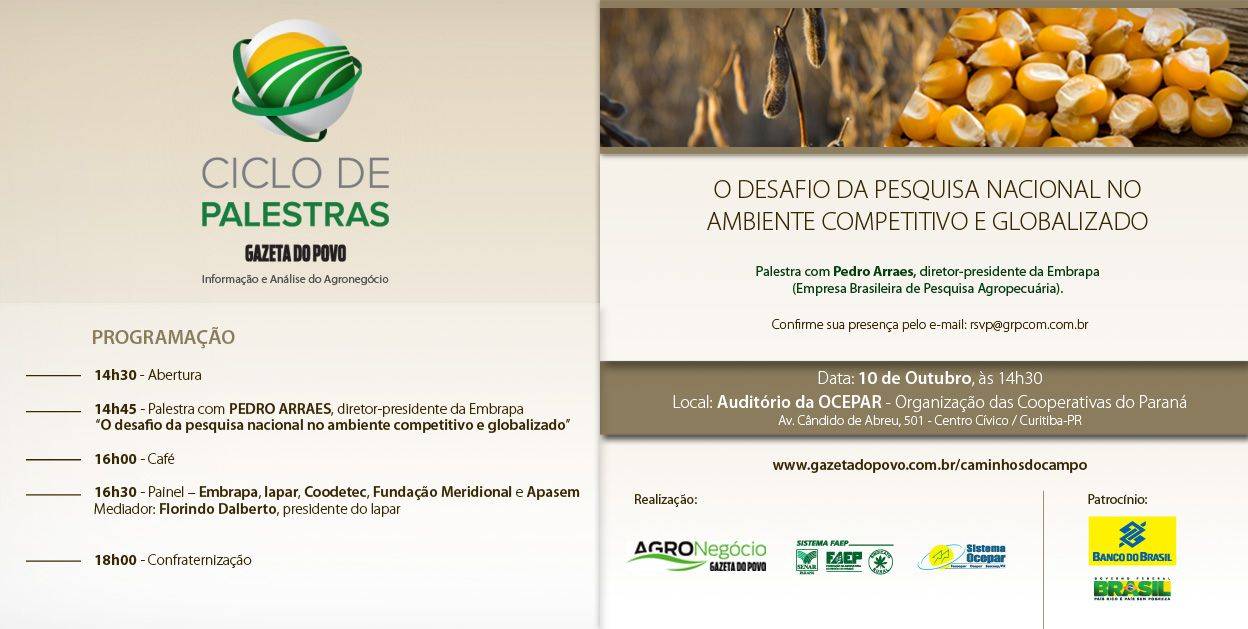 A próxima edição do Ciclo de Palestras Informação e Análise do Agronegócio ocorre em Curitiba no dia 10 de outubro. Com o tema “O desfio da pesquisa nacional no ambiente competitivo e globalizado”, a etapa terá como palestrante o diretor-presidente da Embrapa, Pedro Arraes. A programação contempla um painel com representantes da Embrapa, Iapar, Coodetec, Fundação Meridional e Apasem, que será conduzido pelo diretor-presidente do Iapar Florindo Dalberto.