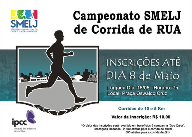 A Secretaria Municipal do Esporte, Lazer e Juventude (SMELJ) abriu no domingo as inscrições para a 1ª etapa do Campeonato SMELJ de Corrida de Rua, que acontecerá no dia 15 de maio. As inscrições podem ser feitas até este domingo (8) no site da Prefeitura de Curitiba, www.curitiba.pr.gov.br.