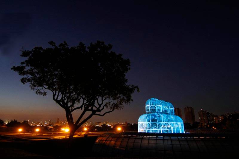 Foto da estufa do Jardim Botânico iluminada, compondo com o céu no começo da noite.