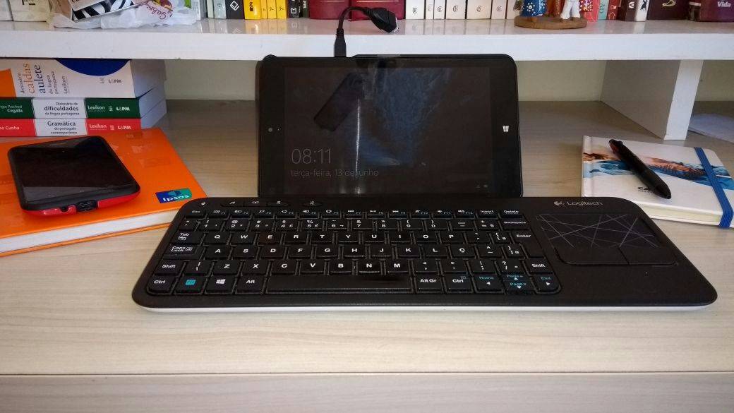 Assim, meu escritório móvel é composto por um tablet Lenovo ThinkPad 8 rodando Windows 10, um teclado Logitech K400 wireless, um smartphone Zenfone 2 Quad-core 1.8, 4GB de RAM e 16GB de memória interna. Levo ainda comigo dois cadernos para anotações e uma caneta com borracha do tipo “stylus” no topo, para marcar textos lidos no tablet.