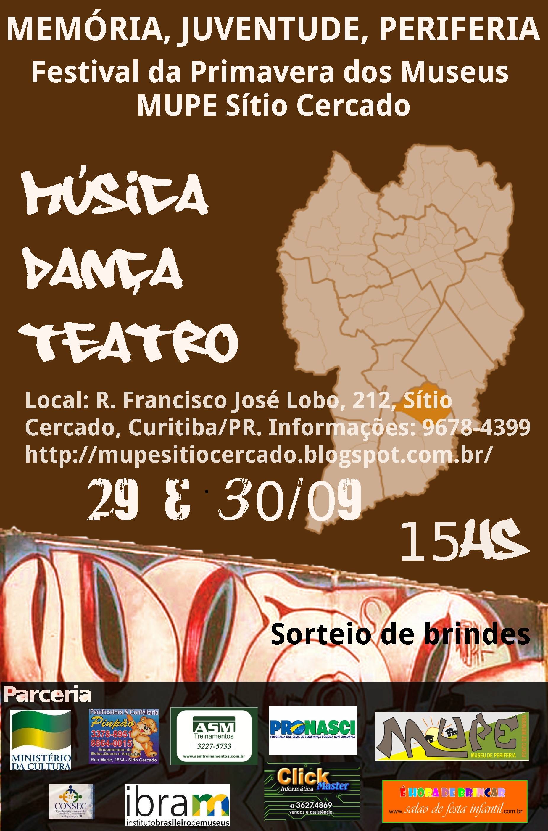 No próximo fim de semana, dias 29 e 30 de setembro, o Museu da Periferia do Sítio Cercado promove o Festival da Primavera. Estão programadas apresentações de capoeira, de teatro e dança e exposições de arte e artesanato. Haverá ainda um baile de confraternização no sábado, a partir das 19h30.