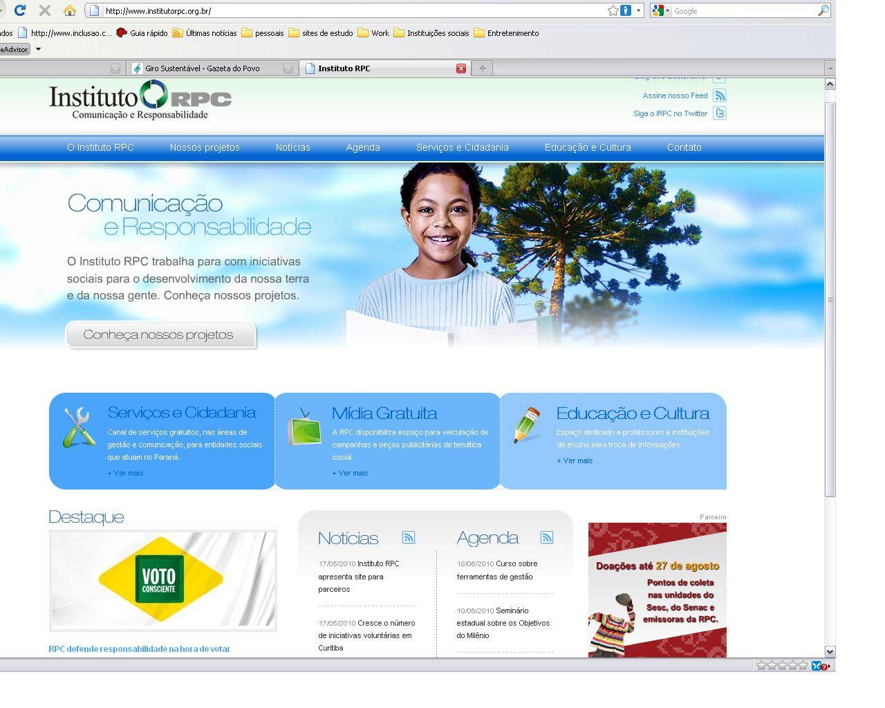 O lançamento do Blog Giro Sustentável acontece ao mesmo tempo em que é lançado o novo site do Instituto RPC e também o projeto Serviços e Cidadania. O projeto articula parcerias com profissionais, organizações de classe, instituições de ensino para que colaborem voluntariamente com as organizações sociais do terceiro setor, nas áreas de gestão e comunicação. A ferramenta on-line facilita a articulação dos voluntários e sistematização das demandas das entidades sociais. Acesse, confira e participe.