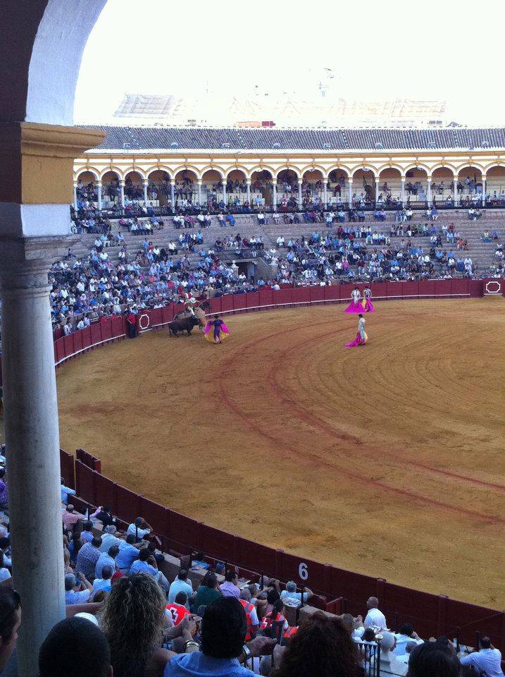 E começa o show. O matador recebe o touro sozinho na arena, no terço final da luta –faena. Matá-lo, Matá-lo! Exclama a plateia, sedenta de prazer e vingança. Olé! Recebem como resposta do toureiro, que desvia a muleta para lá e para cá. O transporte da ganadaria para a praça é estressante ao ponto de lhes reduzir 10% do seu peso. Sem anestesia, são cortadas numa zona sensível de terminais nervosos as pontas dos chifres. Conduzidos com aguilhões e à paulada e sem lantejoula ou ouro, entram na arena sob vaias. Depois das belas danças e em meio a assovios do público, o matador revela uma espada realmente cortante e afiada, de fina ponta, aproxima-se do touro e o atinge pelo pescoço, um ponto específico e mortal, embora o touro resista por 30 minutos. E o som dos aplausos enche a Maestranza. O cavaleiro amarra o touro e desfila com a carne pela arena. Como prêmio, o matador recebe as duas orelhas da besta, para estampá-las na sala de jantar.