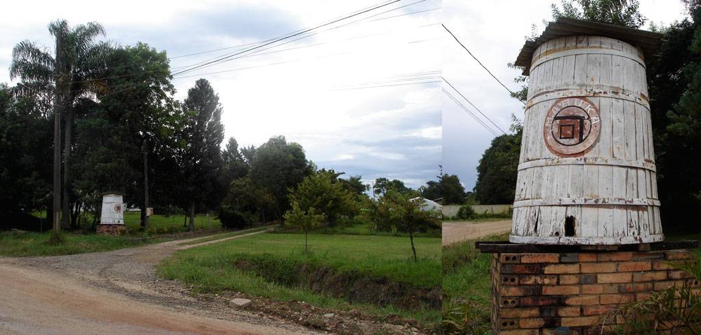 O tonel branco do lado direito da estrada sinaliza a entrada para a chácara.