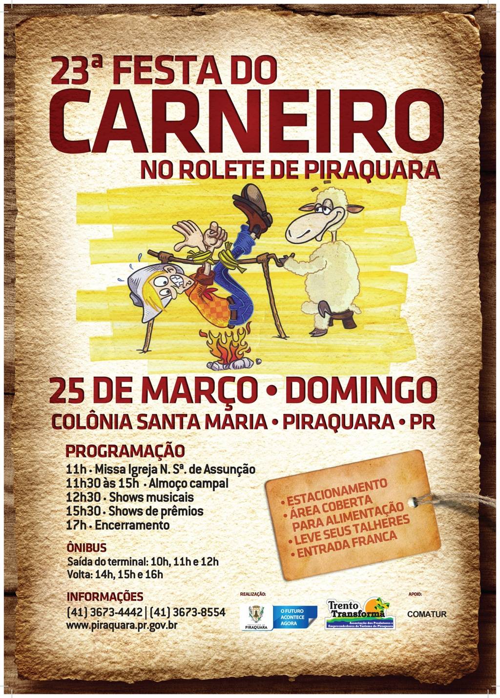 Depois de 2 anos, acontece neste domingo, 25/03, a 23ª festa do Carneiro no Rolete na Colônia Santa Maria do Novo Tirol. Além do carneiro, os visitantes terão a chace de conhecer outros produtos da região, como vinho, queijo, conservas, liguiça e mel.