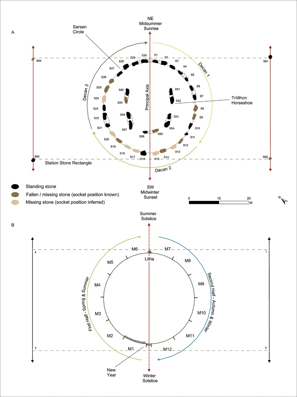 Pois bem; a tese de Darvill é de que o monumento é um grande calendário solar perpétuo. As 30 pedras representam 30 dias, e 12 contagens do círculo completariam 360 dias. O eixo central corresponderia precisamente ao nascer do Sol no solstício de verão e ao pôr do Sol do solstício de inverno, dividindo o ano em duas grandes metades. No solstício de inverno, quando o Sol chega ao ponto mais distante e inicia o seu “retorno”, ele brilharia diretamente através do quinto trílito, alinhado com o eixo central, que funcionaria como um portal.