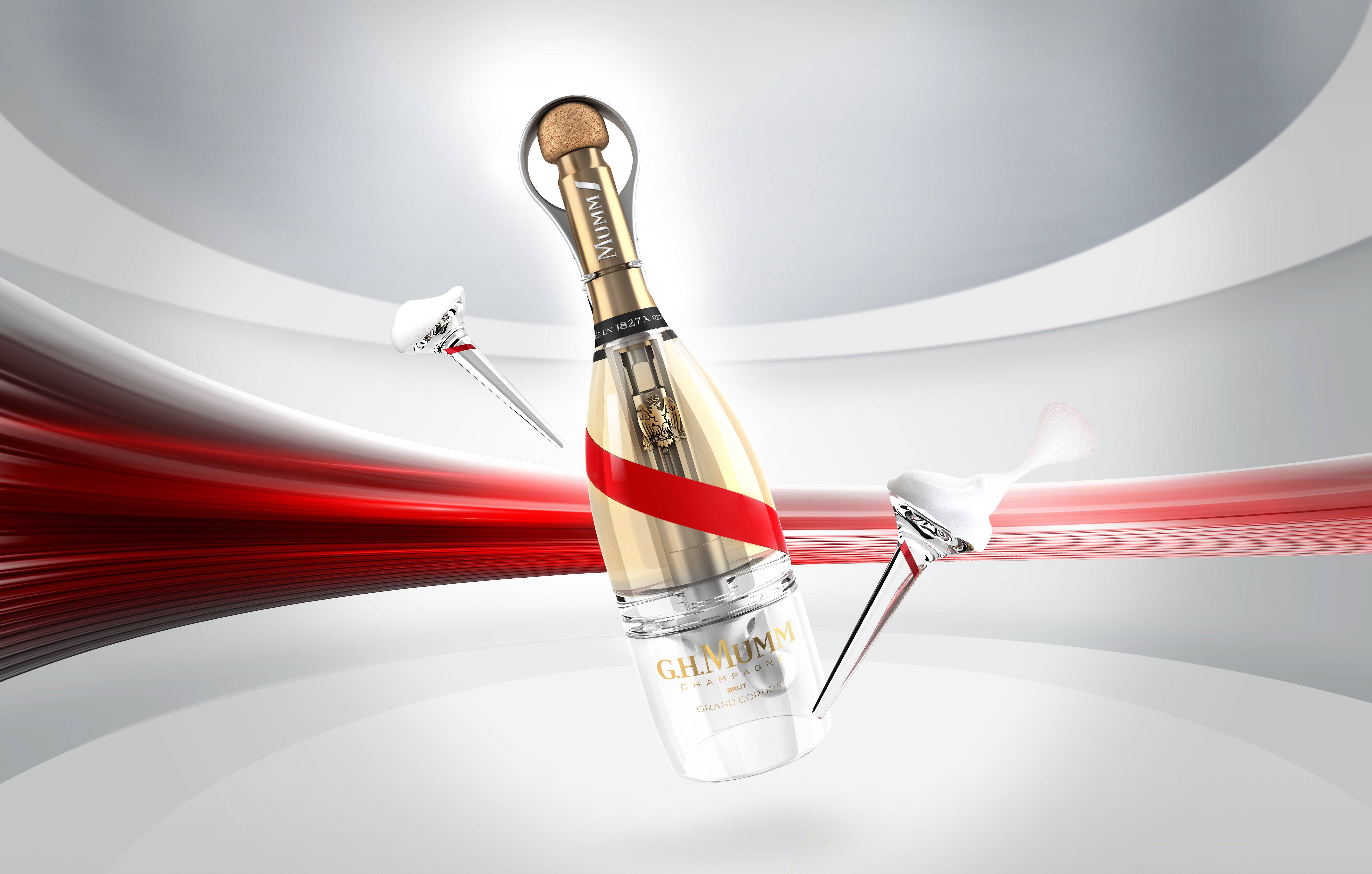 A Mumm Grand Cordon Stellar tem uma revolucionária garrafa de vidro que usa o próprio gás do champagne para expelir a bebida em uma estrutura com formato de anel, para então flutuar até uma taça especialmente projetada para o espaço.