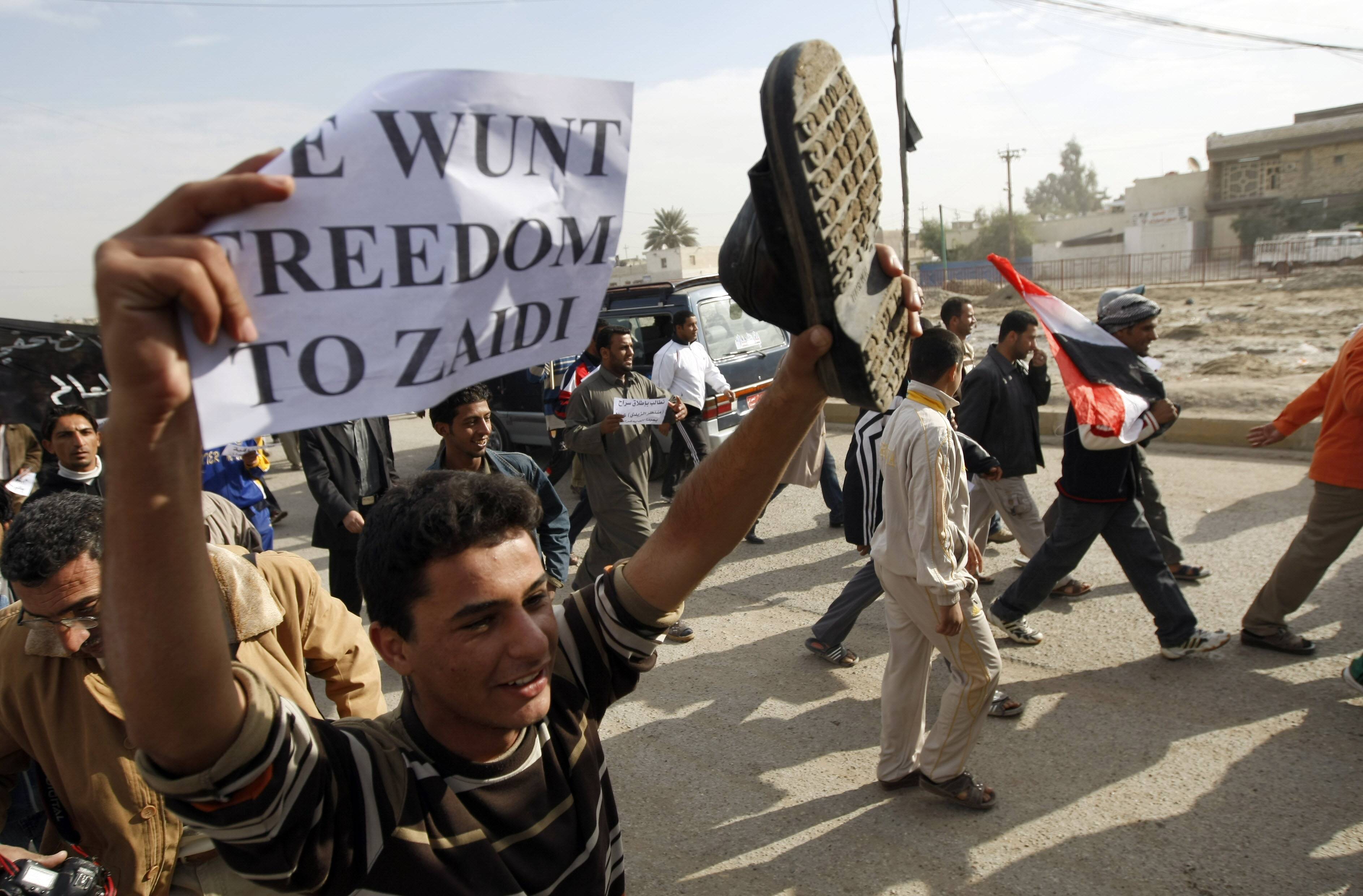 Com sapatos nas mãos, iraquianos protestam contra a prião de jornalista que atirou calçado em Bush