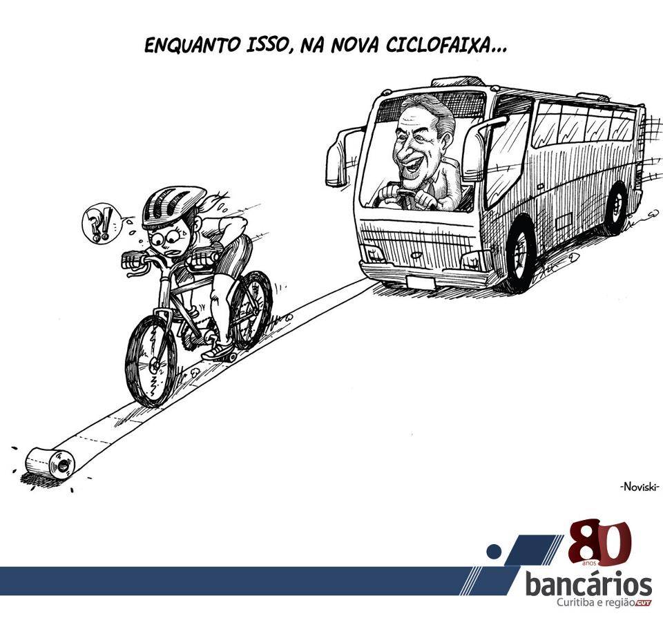 Charge do Sindicato dos Bancários ironiza largura da ciclofaixa da Marechal Floriano, em Curitiba.