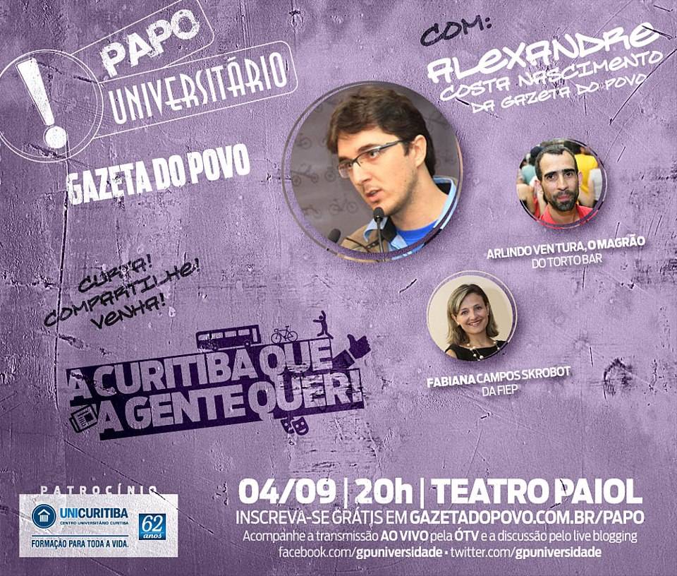 Nesta terça-feira (4), o Papo Universitário, evento promovido pela Gazeta do Povo, vai discutir a ocupação de espaços públicos pela população, o uso de transportes alternativos, a liberdade existente para a organização de manifestações de rua e outras ideias que mexem com a juventude curitibana.