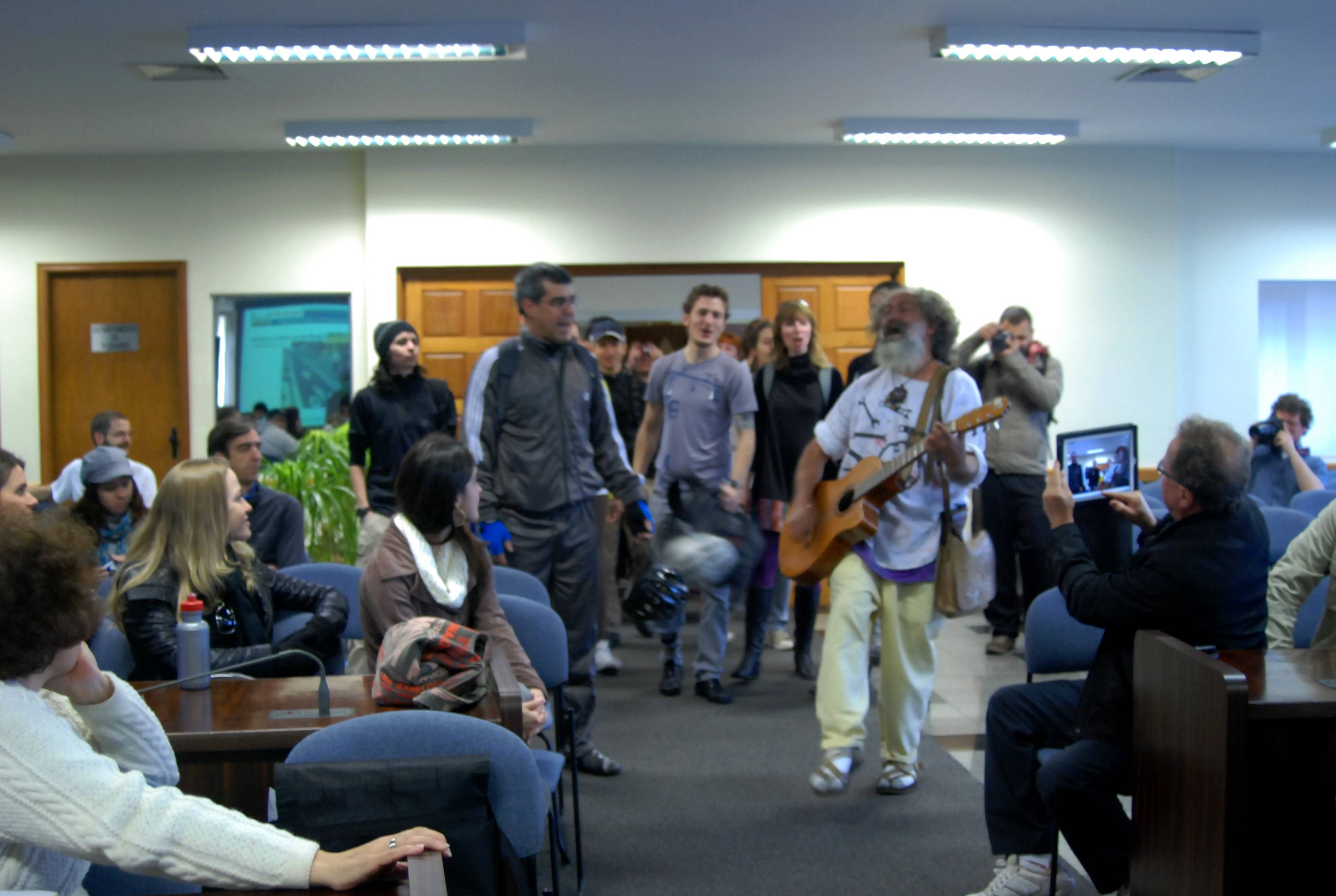 O seminário “Mobilidade Curitiba: A Revolução das bicicletas!”, organizado por iniciativa do vereador Jonny Stica (PT), rendeu palestras e debates durante mais de três horas. Mas, apesar da participação de especialistas em mobilidade, urbanistas, representantes do Ministério das Cidades, Ippuc e da Prefeitura de São Paulo, o ponto alto do evento foi quando cerca de 40 ciclistas “invadiram” o Plenário, interrompendo uma das palestras com canções de protesto exigindo políticas para a bicicleta em Curitiba.