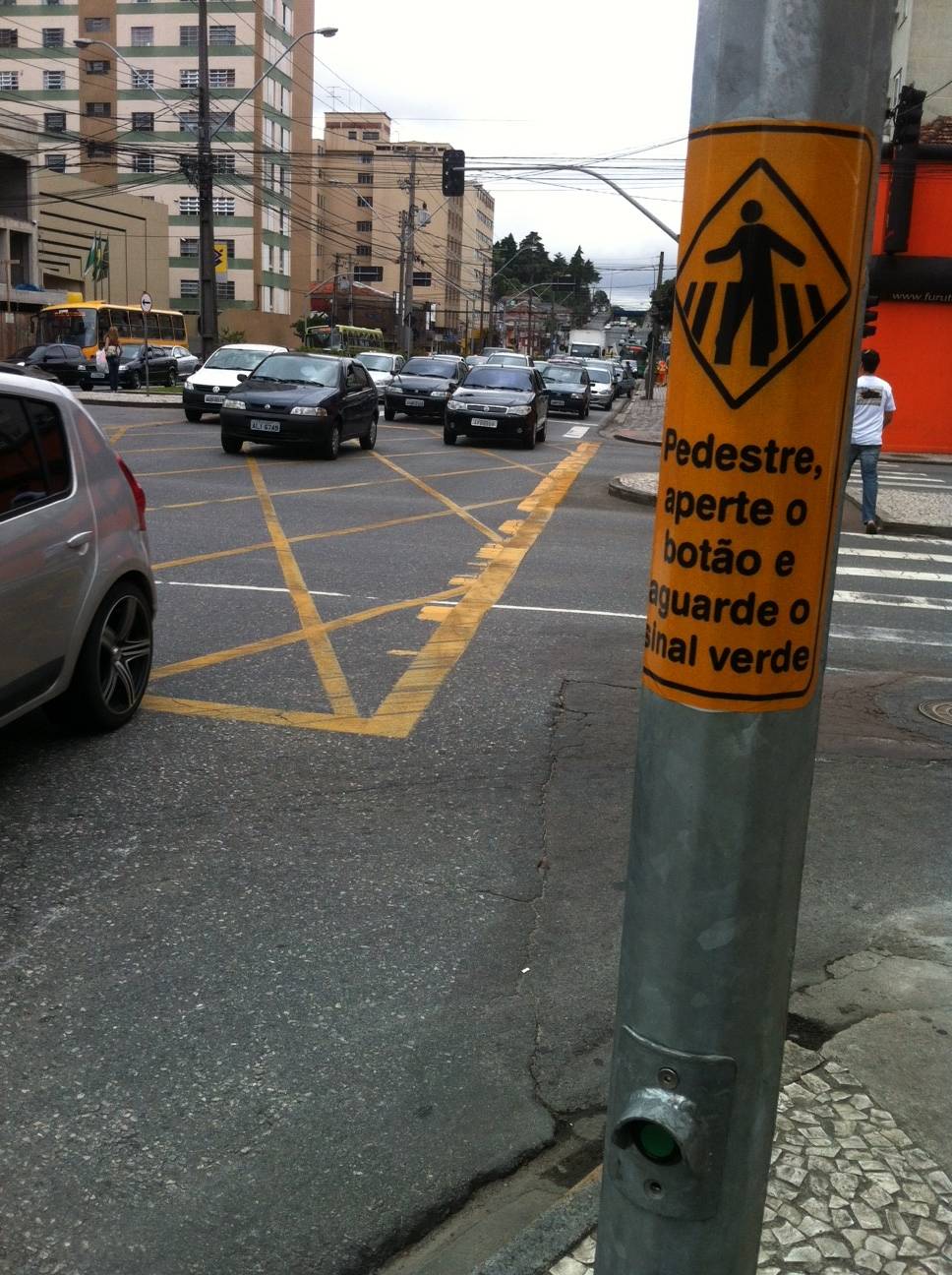 Para conseguir atravessar nos 10 segundos que tem de sinal aberto, o pedestre tem andar em velocidade de 3 metros por segundo, ou, 10,8 km/h — 116% acima da velocidade normal de uma caminhada. Resumindo: para atravessar a rua você tem que apertar um botão, esperar até 1,5 minuto e sair correndo!