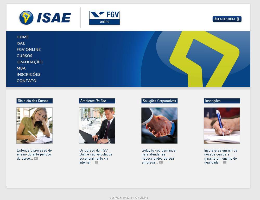 Cursos on-line gratuitos e de curta duração estão disponíveis no site do ISAE/FGV. As formações são nas áreas de Direito, Economia, Educação e Comunicação, História, Ética e gestões Financeira, de Projetos, Socioambiental, Empresarial, de Marketing, de Pessoas e de Produção. A Fundação Getulio Vargas (FGV) é a primeira instituição brasileira a aderir ao OpenCourseWare Consortium, um consórcio internacional que oferece pela web conteúdos e materiais didáticos sem custo.