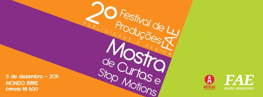 Dois curtas-metragens e seis stop motions produzidos por alunos do 6.º período dos cursos de Design e Publicidade e Propaganda da FAE Centro Universitário serão apresentados nesta quarta-feira (5), a partir das 20 horas, em Curitiba, durante o II Festival de Produções da instituição. O evento será no Mondo Birre (Rua Coronel Dulcídio, 558, no Batel).