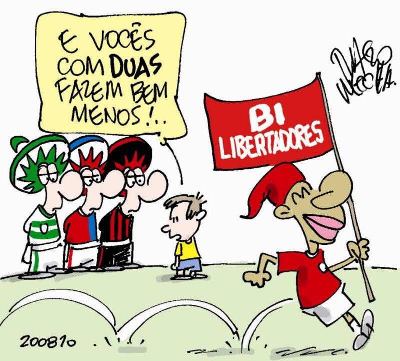 Acho que ninguém entendeu muito bem a charge de ontem, com Paranito e Atleticon assistindo tevê (talvez o jogo do Inter) e um fantasma, ou alguém coberto por um lençol branco ao fundo (com algumas indicações de que se tratava de Corisco, como o detalhe de um sombrero) supostamente querendo assustá-los e… é, também não entendi. E essa de hoje?