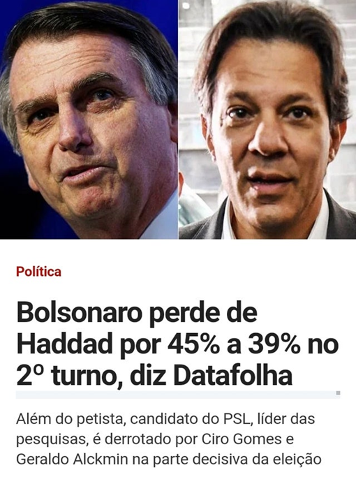 Mesmo assim, ainda em 28 de setembro daquele ano o Datafolha apostava (“apostar” é o verbo adequado) na vitória de Haddad (45% x 39%). Segundo o Datafolha, Bolsonaro perderia até para Alckmin e Ciro Gomes. Só ganharia de Marina Silva, e ainda assim por muito pouco: