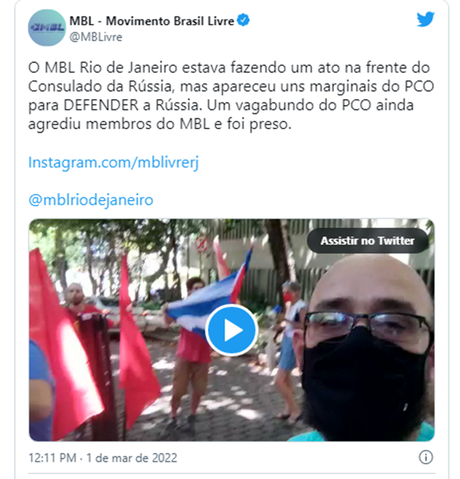 “O MBL Rio de Janeiro estava fazendo um ato na frente do Consulado da Rússia, mas apareceu uns marginais [sic] do PCO para DEFENDER a Rússia. Um vagabundo do PCO ainda agrediu membros do MBL e foi preso.”