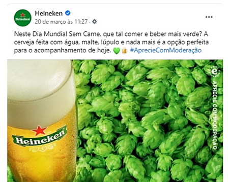 “Neste Dia Mundial Sem Carne, que tal comer e beber mais verde? A cerveja feita com água, malte, lúpulo e nada mais. É a opção perfeita para o acompanhamento de hoje”, dizia a postagem, naquele tom paternalista habitual nesse tipo de campanha.
