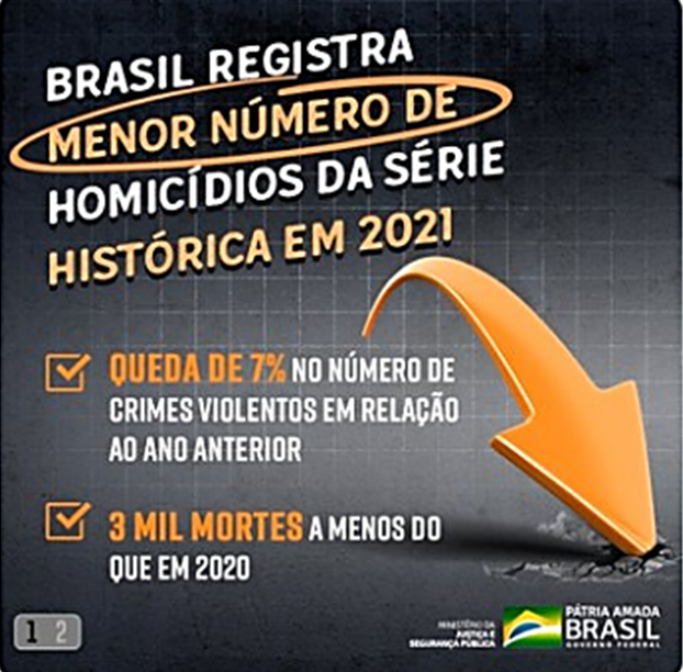 Nos últimos dias, o Governo federal divulgou dois dados importantes que foram tratados pela grande mídia de forma quase confidencial. primeiro, a queda significativa do número de homicídios no Brasil em 2021; e o desempenho agregado da economia brasileiro no biênio 2020/2021, o período da pandemia de Covid-19 – desempenho superior ao de todos os países ricos, com exceção dos Estados Unidos.