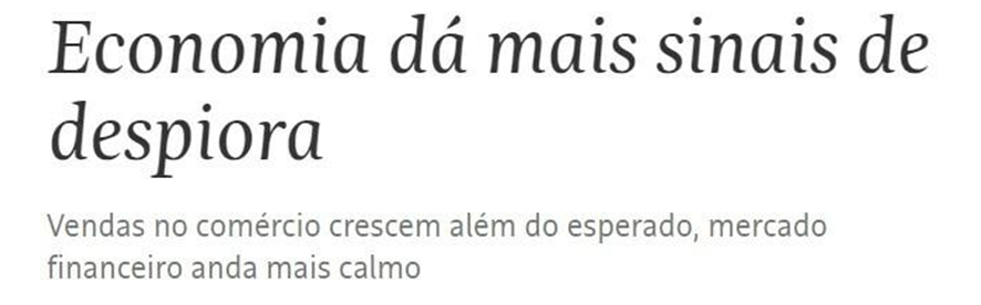 - “Economia dá sinais de despiora”. A economia brasileira não pode melhorar, só despiorar. A “Folha de S.Paulo” preferiu empregar um verbo bastante esquisito a admitir que a economia melhorou.