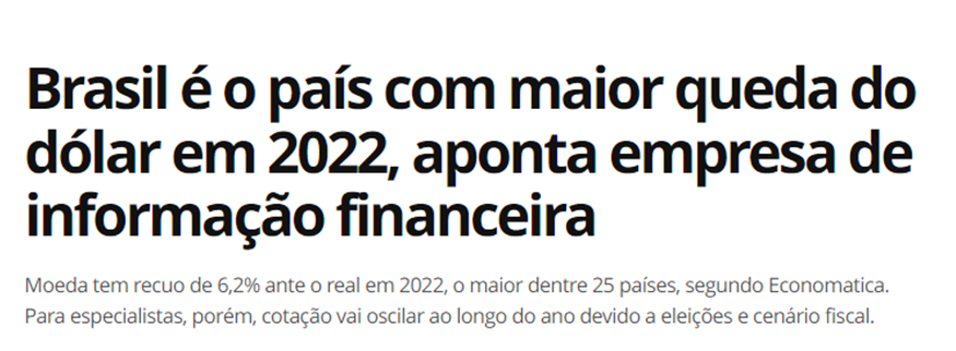 - “Brasil é o país com maior queda do dólar”. Esta foi mais sutil. Em vez de noticiar a valorização (palavra de viés positivo) da moeda brasileira, o jornalista deu um jeito de embaralhar as palavras para confundir o leitor desavisado: “O Brasil é o país com maior queda...” A redação honesta seria: “Moeda brasileira foi a que mais valorizou em 2022”.