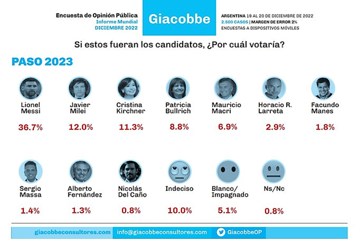 Messi liderou uma hipotética disputa com políticos profissionais, como o atual presidente Alberto Fernández e os ex-presidentes Maurício Macri e Cristina Kirchner: o atacante teve 36,3% dos votos, contra 11,3% de Cristina e 1,3% de Fernandez.