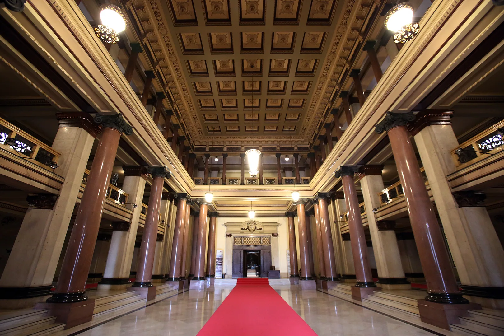 A descrição do salão é do próprio tribunal: “Ladeado por escadarias revestidas em mármore de Chiampo; piso em mármore de Carrara; corrimãos em mármore amarelo português e detalhes de balaústres em mármore e bronze. No perímetro da sala, estão dispostas 16 colunas jônicas de granito vermelho polido de Itu, pesando aproximadamente 15 toneladas cada, com bases e capitéis de bronze, desenhadas pelo arquiteto ítalo-brasileiro Domiciano Rossi”.
