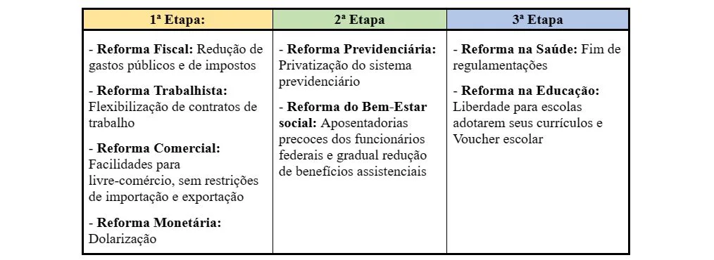 O resultado foram crises e mais crises recorrentes. O candidato Javier Milei tem um discurso focado na economia, mas que diretamente afeta as bases do peronismo. Para alcançar seus objetivos programou reformas profundas no próprio Estado, divididas em três etapas, que devem ser implementadas em sequência: