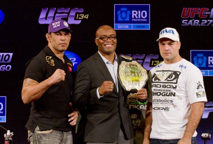 Anderson Silva entre Rodrigo Minotouro e Mauricio Shogun na apresentação do UFC do Rio. Campeão é fenômeno também de marketing