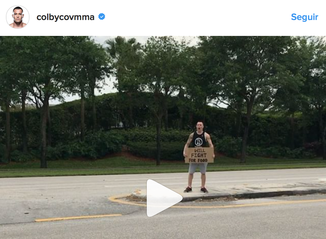 Segurando uma placa com os dizeres “luto por comida” no meio de uma avenida, o meio-médio (até 77 kg) postou um vídeo em sua conta no Instagram (veja abaixo). Nos comentários, ressaltou que “tempos drásticos pedem medidas drásticas” e mencionou que possíveis adversários no UFC estão fugindo dele.