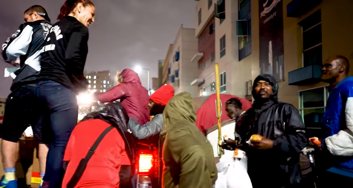 Na última sexta-feira (16), ela e o noivo Ray Elbe distribuíram hambúrgueres para um grupo de sem-teto no centro de Los Angeles. Ao todo, foram compartilhados 222 lanches da rede In-N-Out Burger.