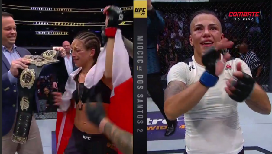 “Eu vim com essa garra desde começo, infelizmente não deu. Tenho muito caminho pela frente, muita coisa para aprender, vou treinar mais ainda e vou disputar de novo o cinturão e sair campeã”, falou Jéssica, que é homossexual assumida e pediu a namorada, Fernanda, em casamento após o combate.