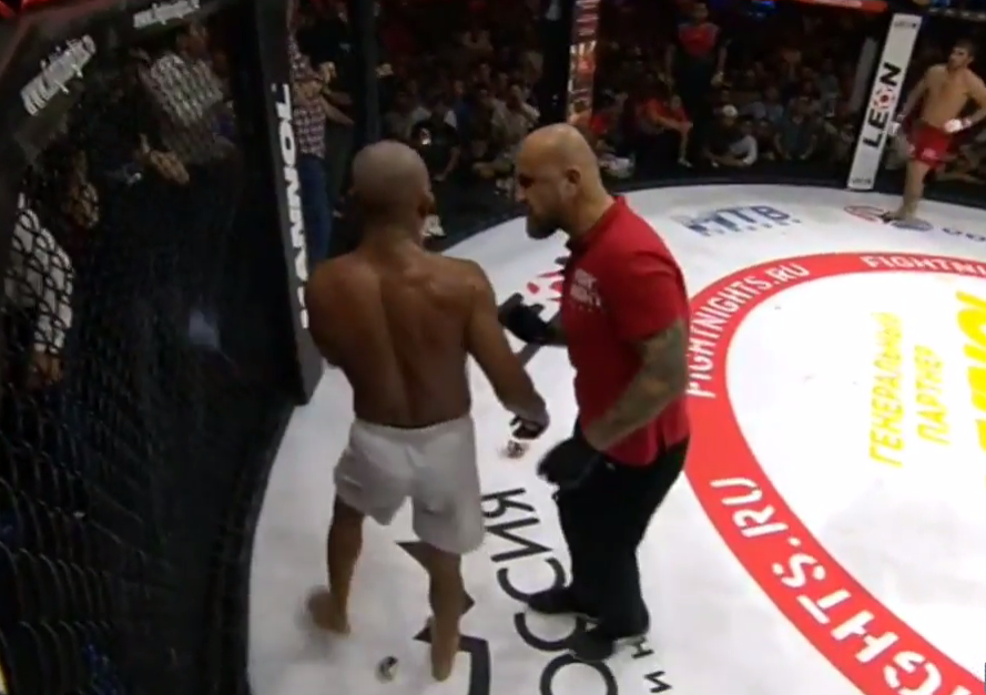 A torcida local, então, se revoltou e começou a atirar garrafas e latas dentro do cage. Irritado, o ex-lutador do UFC escalou a grade, aparentemente abandonando a luta. Ele voltou minutos depois, mas foi declarado perdedor por nocaute técnico (desistência).