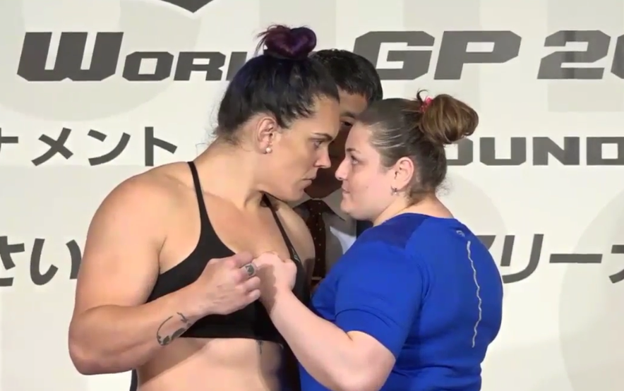 O duelo contra a peso-pesado (até 120 kg) brasileira Gabi Garcia terminou sem resultado após um dedo no olho acidental provocado pela especialista em jiu-jítsu. Veja abaixo: