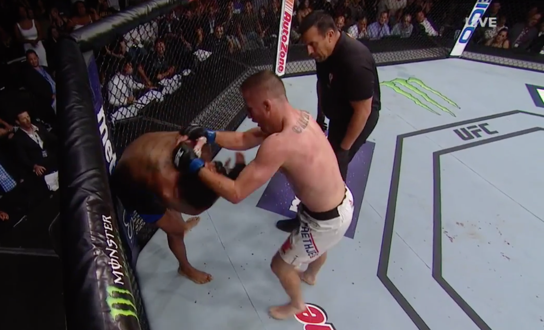 Mesmo assim, ele resistiu até o fim do round e virou o jogo a partir da metade no assalto seguinte. O começo do fim foi um uppercut que entrou no queixo do rival, seguido por uma joelhada voadora.