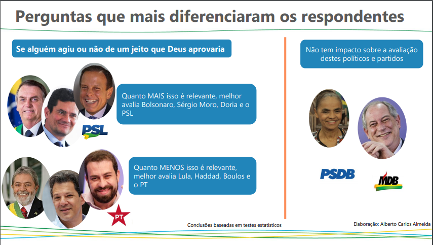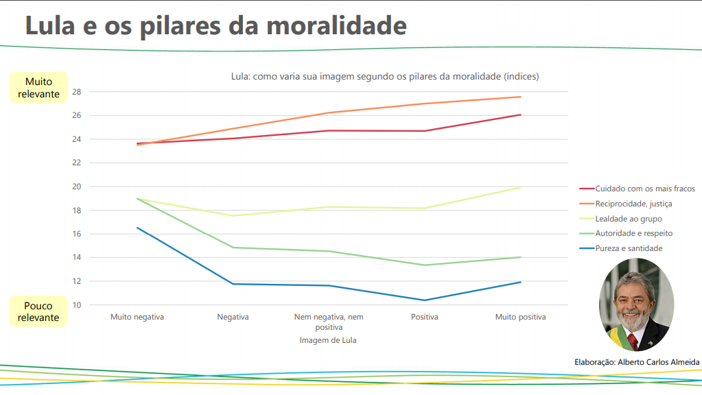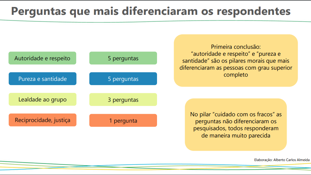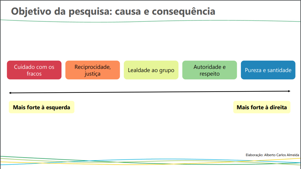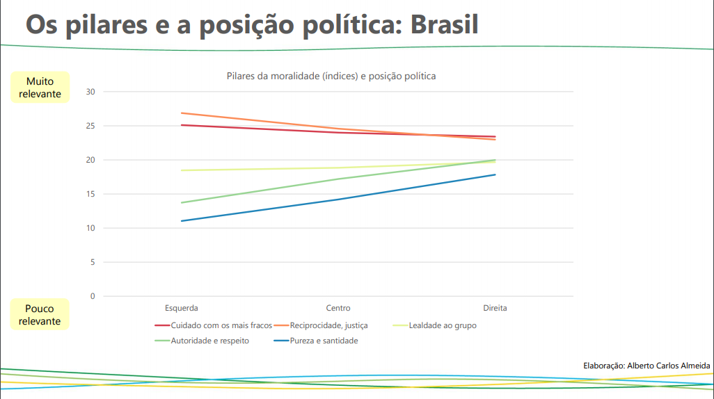 "O voto e o apoio a políticos de esquerda e de direita têm fundamentos morais, cada lado tem uma moralidade diferente. O eleitor que muda de voto – que decide a eleição – é aquele que tem uma determinada combinação da intensidade de cada pilar moral", conclui Alberto Carlos Almeida.