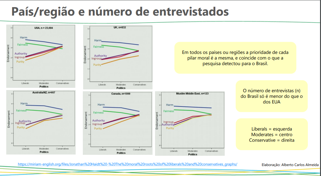As pessoas que se entendem como de direita no Brasil - ou como conservadoras em outros países - dão mais ou menos a mesma importância a todos os pilares. As que se consideram como de esquerda no Brasil - e liberais em outros países - dão pouca importância a dois pilares (Autoridade e Respeito, Pureza e Santidade) e muito mais importância a outros dois (Cuidado com os Mais Fracos, Reciprocidade e Justiça). O curioso é que o mesmo resultado se repete nas mais diversas culturas, inclusive no Oriente Médio.