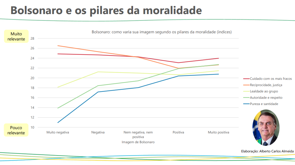 Segundo a pesquisa, na política brasileira atual, alguns símbolos já estão intimamente relacionados com valores morais do brasileiro. A "lealdade ao grupo" está intimamente ligada ao amor ao Brasil e orgulho da nossa história, "pureza e santidade" parecem sob medida para os princípios religiosos e "autoridade e respeito" se encaixam na imagem das Forças Armadas. São conceitos com os quais Jair Bolsonaro sente-se muito à vontade. Na versão de Sergio Moro, a "autoridade e respeito" vem do Judiciário.