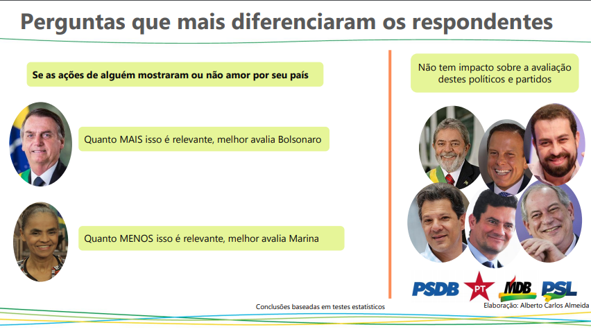 Por exemplo: amor pelo país divide radicalmente apoiadores de Jair Bolsonaro e Marina Silva, mas não tem impacto nas demais personalidades ou partidos políticos.