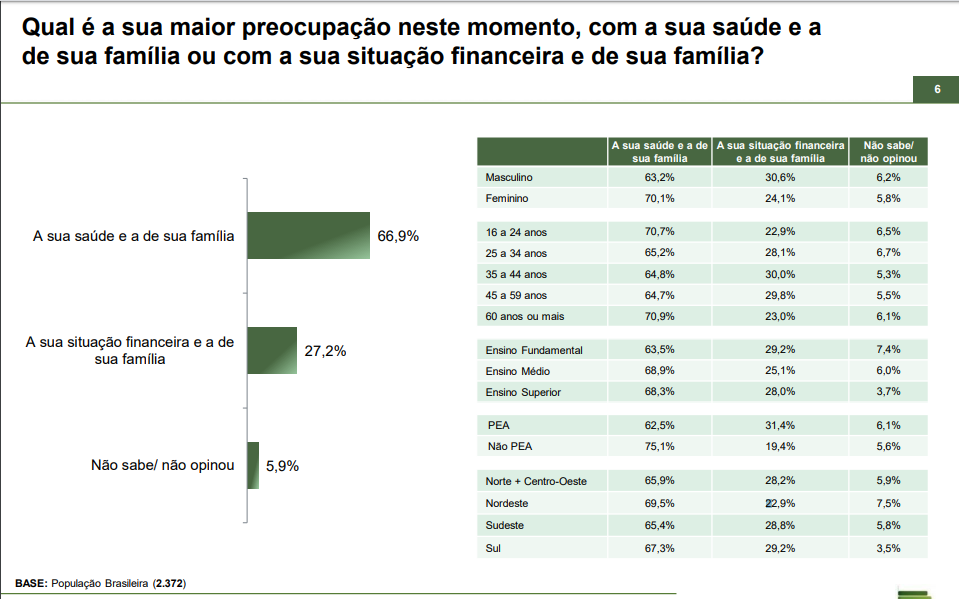 As variações com relação a faixa etária, sexo, escolaridade ou região são muito pequenas. A proporção de duas pessoas se dizendo mais preocupadas com a saúde da família para uma se dizendo mais preocupada com problemas financeiros parece se repetir em todo o país.