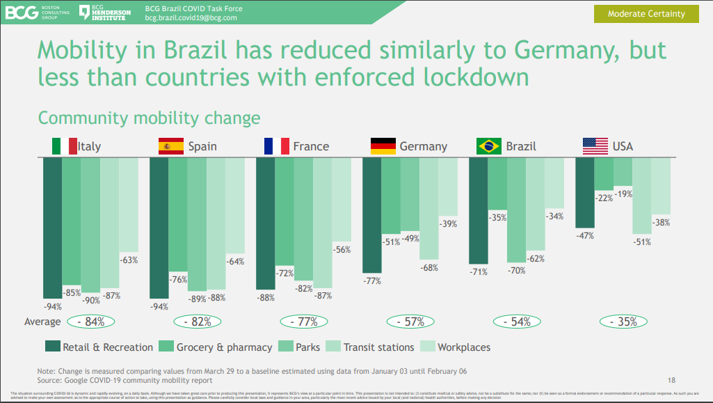 Os países que obtiveram mais isolamento social efetivo são os que realmente impuseram quarentena ou lockdown, regimes em que a pessoa pode até ser multada e presa se estiver na rua quando não deve, casos da Itália, Espanha e França. A redução nas atividades tem sido parecida com a da Alemanha, um geral de 54%.