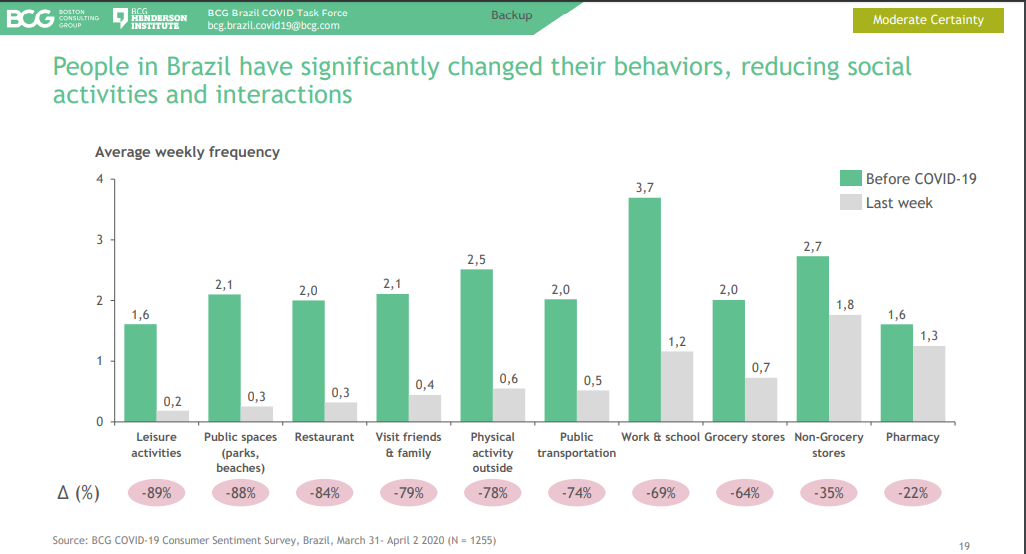 Obviamente os hábitos e realidades sociais são diferentes entre os países pesquisados. Por isso, o Boston Consulting Group fez também um comparativo entre quanto os brasileiros saíam para várias atividades além do trabalho e quanto estavam fazendo entre 31 de março e 2 de abril. O gráfico mostra o número de vezes em que cada uma das atividades era feita por semana e qual a nova realidade.