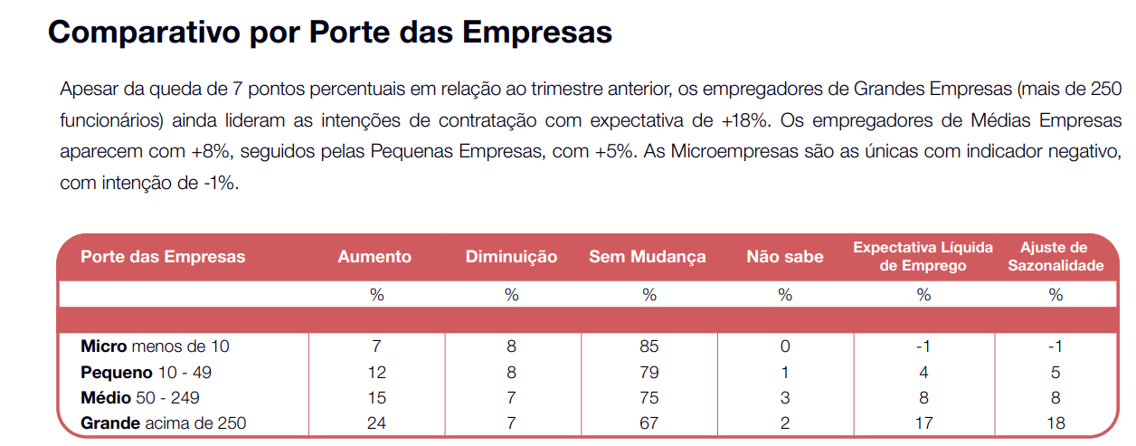 Levantamentos como este não nos possibilitam planejar, mas já trazem o benefício de tornar possível projetar e analisar de que forma estamos crescendo, quem está crescendo e o que podemos esperar para a realidade das famílias brasileiras, ancoradas no emprego. Levando em conta as expectativas para o ano que vem, pequenas empresas estão em baixa - e elas são as responsáveis pela maioria dos postos de trabalho. Já as grandes empresas estão em alta. Quanto maior a empresa, melhor a expectativa para o início do ano que vem.