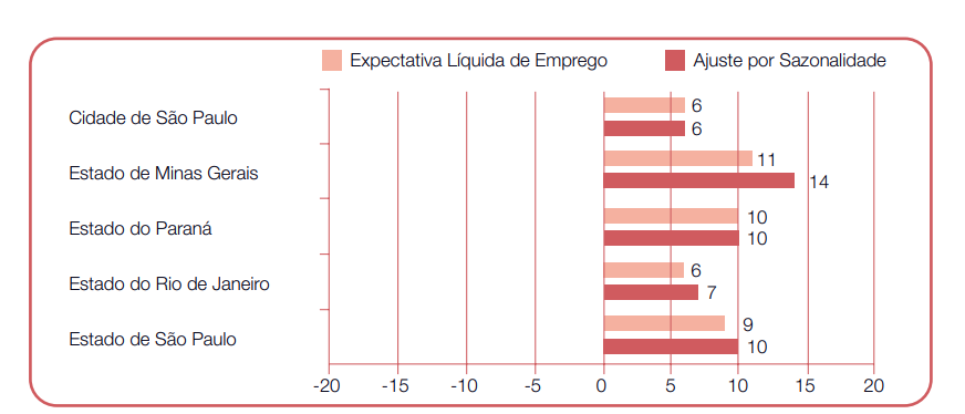 As diferenças regionais também ficam claras a partir do estudo. Foram entrevistados 815 empregadores e o maior percentual de quem pretende abrir vagas no primeiro trimeste está concentrado na região sudeste do Brasil. O estado mais otimista é Minas Gerais, seguido por um estado do sul, o Paraná - único fora do sudeste na lista dos mais otimistas. Os números do Rio de Janeiro parecem discretos, mas são importantes quando colocados em perspectiva: o estado teve uma melhora de expectativa de 10 pontos percentuais com relação ao primeiro trimestre do ano passado.