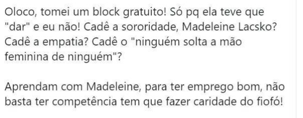 Então eu sairia chorando minha dor feito homem pelos quatro cantos, bradando contra tantas injustiças que sofri, conclamando o Brasil a se manifestar a meu favor e contra o Twitter. Nada disso, apenas o silêncio e a porta trancada. Algumas amigas me disseram que esse comportamento chama-se "ghosting". Gostaria muito de entender qual foi a gota d'água e também dizer de volta minha meia dúzia de verdades entaladas na garganta. Na impossibilidade de ser ouvida pelo Twitter, digo a vocês.