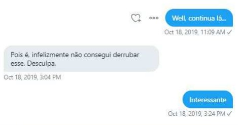 Não quis causar tumulto nem mais confusão entre amigos. Amizade de gente desse naipe vocês imaginam a montanha russa que é. Não seria eu a piorar as coisas. Foi em confidência que disse ao Twitter o que pensava. Da maneira mais fria, ele me disse que não havia nada de errado com a forma como seus amigos me tratavam.